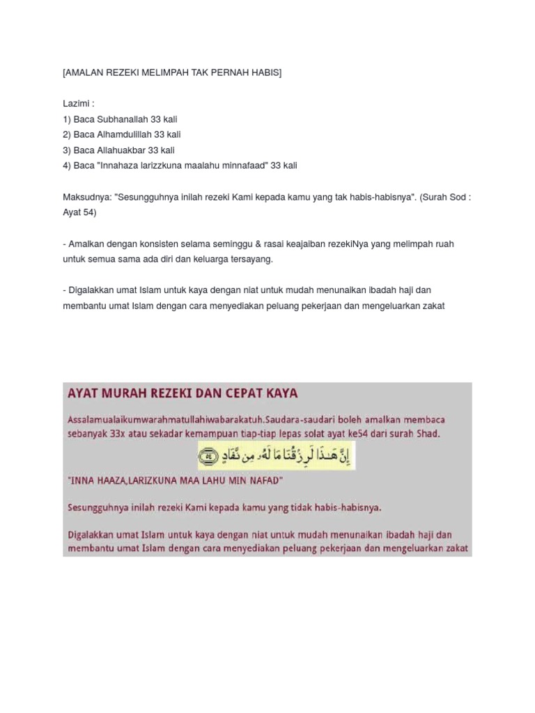 Sebagaimana yang diberitahu melalui hadis nabi muhammad saw. Begitu juga jika kita inginkan rezeki yang melimpah dan berkat, jom amalkan 7 zikir ini sebagai amalan menjemput rezeki. Rezeki hadir kerana keberkatan waktu pagi. Semoga allah memberikan kita rezeki yang melimpah ruah serta berkat. Amalkan 7 zikir ini untuk rezeki melimpah ruah. Saya biasa merutinkannya setiap waktu. Amalkan 7 zikir ini untuk rezeki melimpah ruah! Turut terkandung di dalam ebook ini. Untuk pengetahuan anda, rezeki yang tuhan beri pada kita adalah pinjaman. Oleh itu beliau ajarkan riyadhah atau amalan yang jika dilaksanakan terus menerus, insya allah akan mendapatkan rezeki melimpah ruah. Dengan keyakinan bahawa allah akan menyelesaikan beban hutang kita dengan mendatangkan rezeki yang melimpah ruah kepada kita. Padahal tidak sesempit itu, rezeki juga berbicara mengenai kesehatan, keselamatan hidup, kejernihan pikiran, kelapangan hati, dan lain sebagainya. Rezeki itu sendiri luas.sihat itu rezeki;bahagia itu rezeki ;banyak masa itu rezeki disayangi itu rezeki;tidak putus duit.