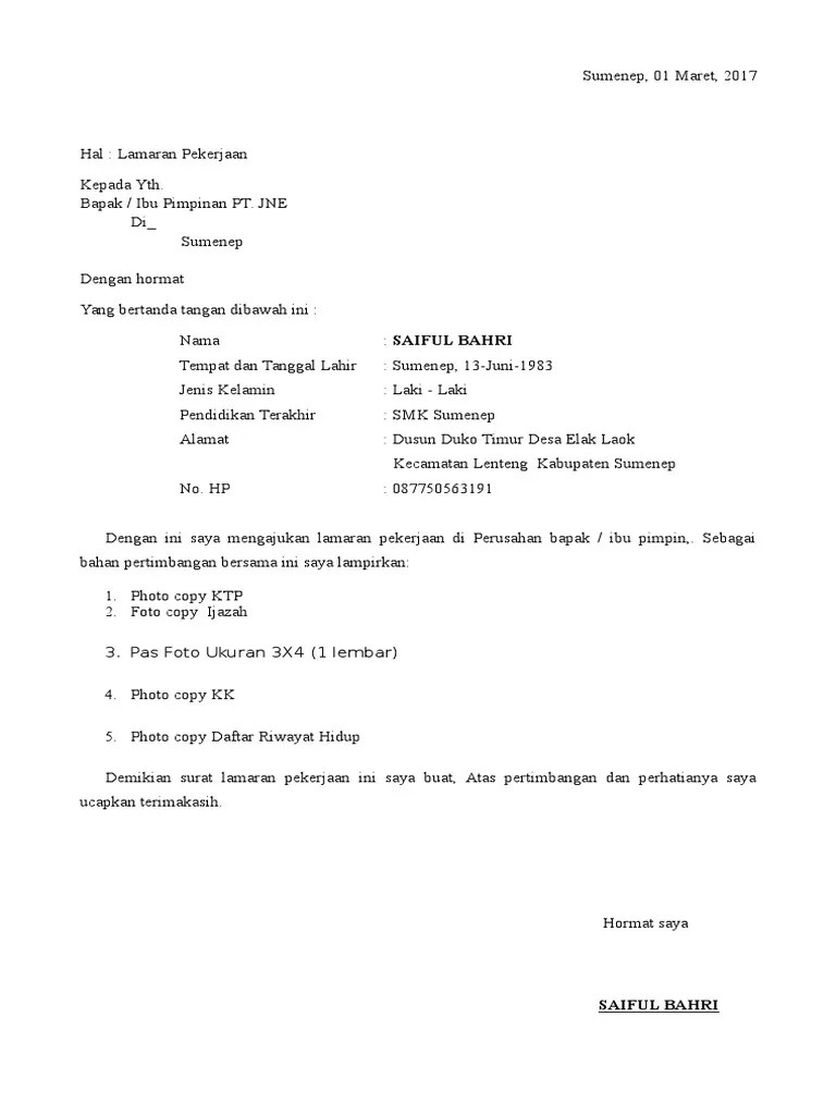 Berikut ini contoh surat lamaran kerja yang baik dan benar serta menarik perhatian yang dapat anda gunakan dalam tema maupun format penulisan surat. Contoh surat lamaran kerja di jne saat ini menjadi kata pencarian yang cukup banyak dilakukan di internet. Hal ini karena perusahaan yang bergerak dalam bidang jasa pengiriman barang dan logistik ini sudah sangat populer. Hrd manager pt berkas jaya grup jl. Lamaran kerja mesti dibentuk secara resmi.